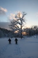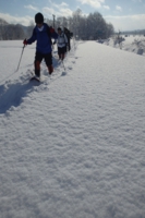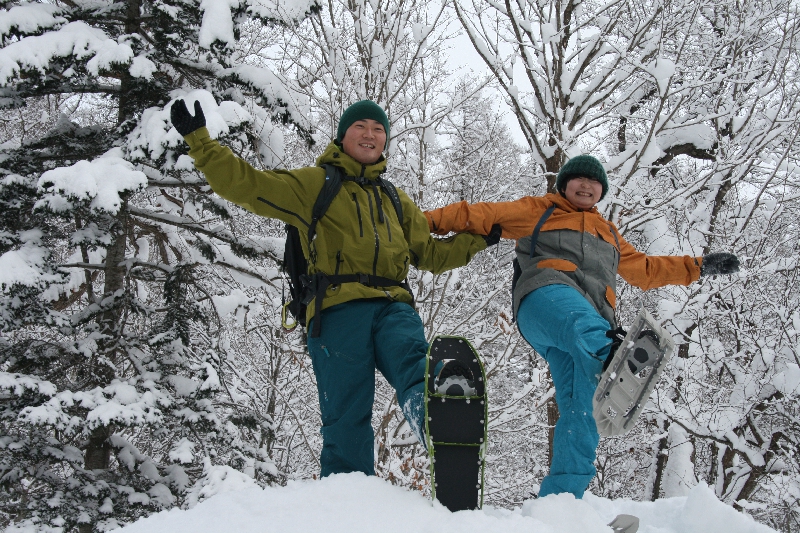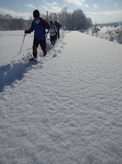 積もりたての新品の雪面にスノーシューの足跡をつけながら。