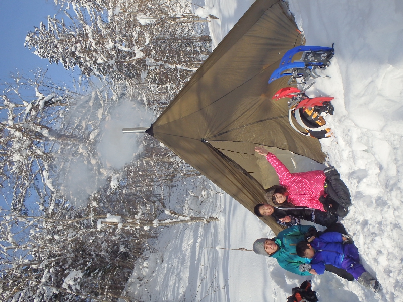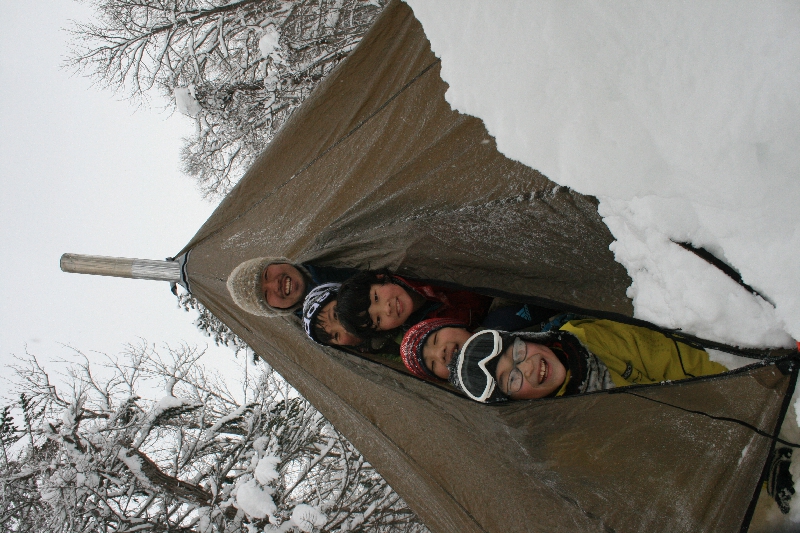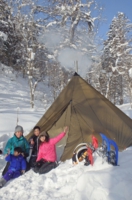 森の中にテントを建てて秘密基地をつくったら、新雪をふかふか散策したり、ソリコースをつくって滑り下りたり!