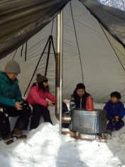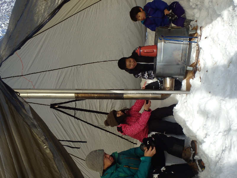 テントの中では、薪ストーブで焼きマシュマロに挑戦!